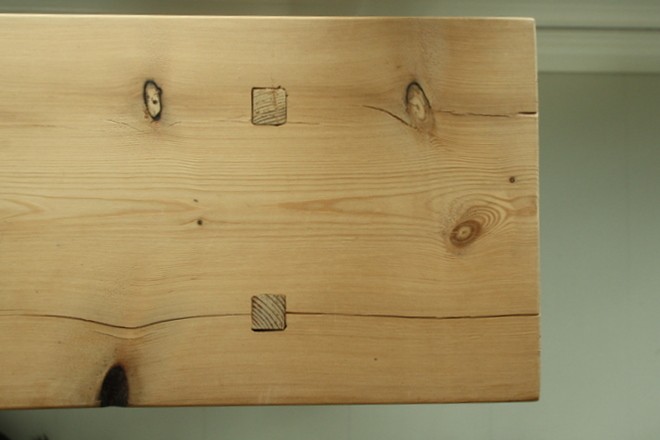 Sohvapöytä-postauksessa vilahti tämä puupenkki, josta kyseltiinkin jo. Penkki on minun ja mieheni opiskeluasuntomme parvekkeella tekemä! Teimme silloin samalla ruokapöydän ja tämän penkin. Mallia otettiin kesämökin vanhasta penkistä ja upotimme jalat samaan tyyliin. Penkki on siis ainut laatuaan. Onpa muuten kiva, että paljas puupinta näyttää taas hyvältä, olimme ilmeisen trendikkäitä jo silloin vuosia sitten :) Penkki sopii hyvin ikkunoiden eteen, tarjoaa istumapaikkoja ja säilytyspaikan jälleen yhdelle lehtipinolle. Ja huomaatteko, sopii hyvin yhteen sohvan jalkojen ja sohvapöydän pienen korin kanssa! (ikkunoiden välistä puuttuu vielä lista, mikä vaikeutti valokuvaamista :)